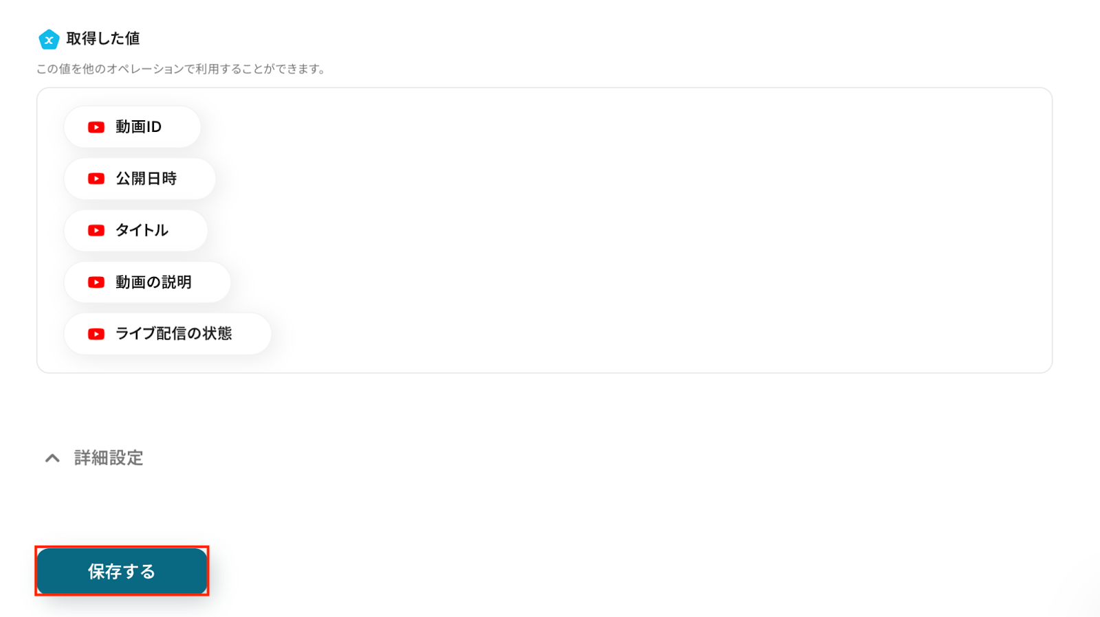 問題がなければYoomの操作画面に戻り、取得した値を確認し、「保存する」をクリックします。