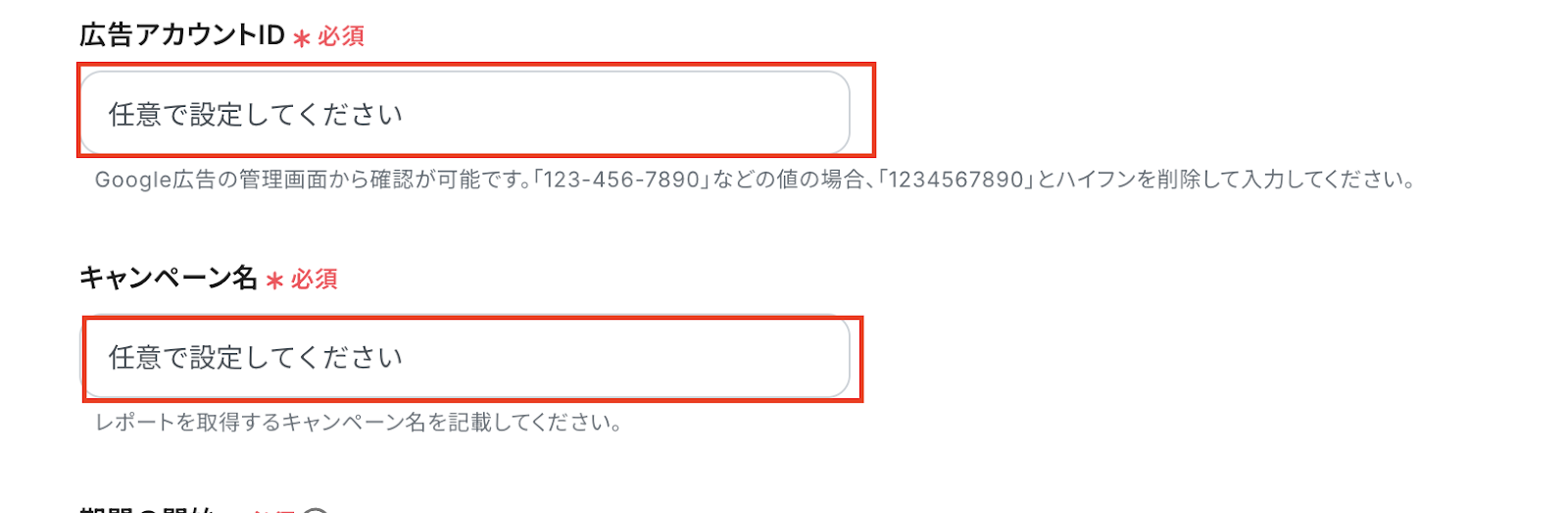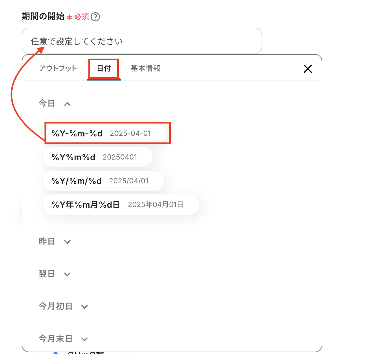 期間の開始と期間の終わりは日付の項目から設定してください。