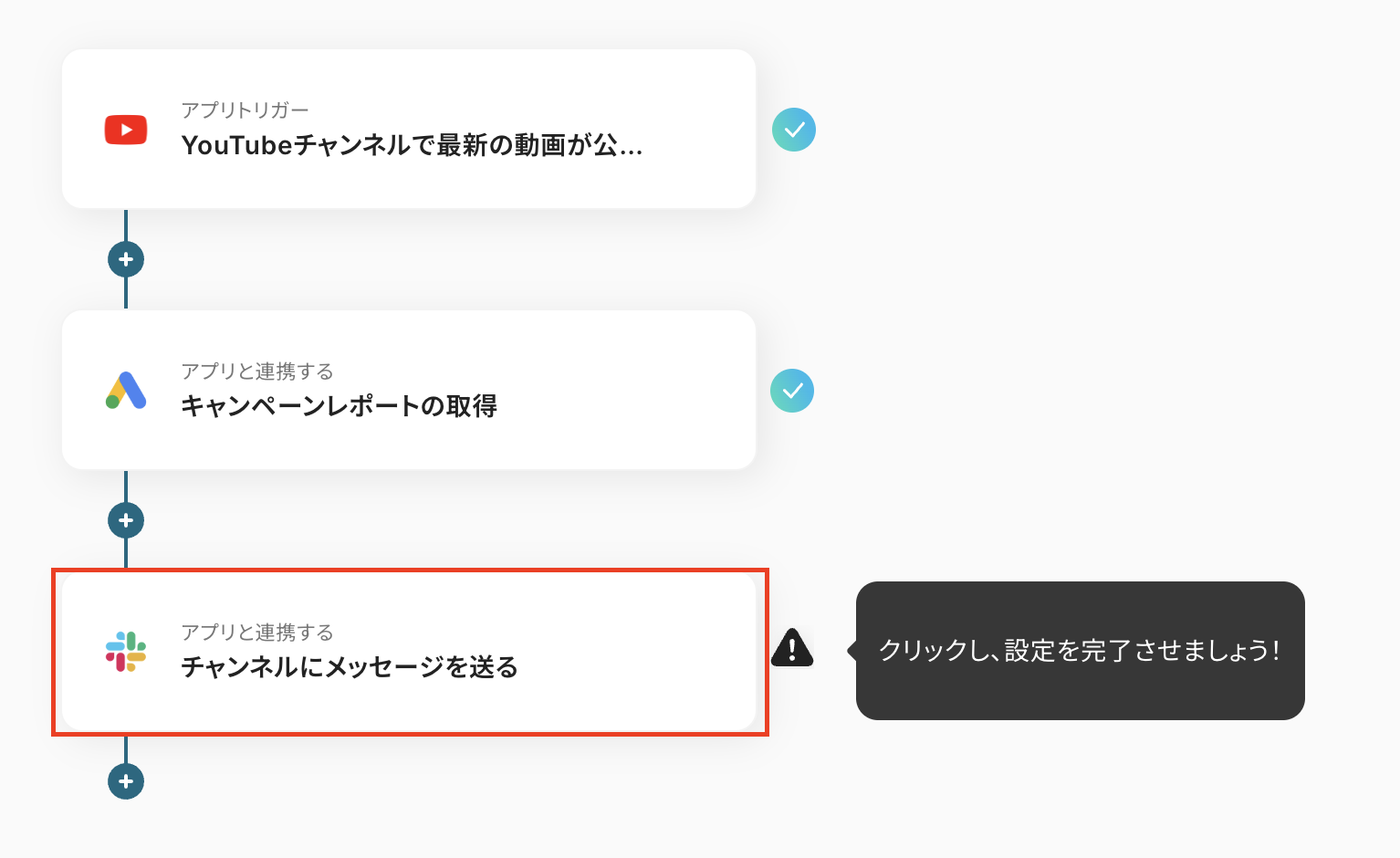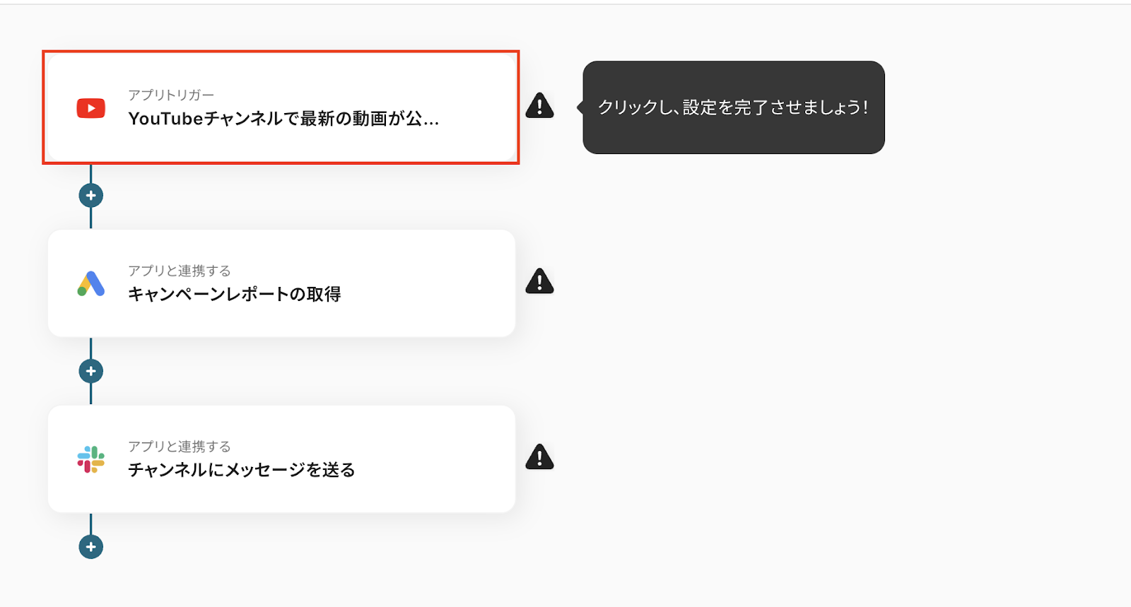 - YouTubeのトリガー設定およびGoogle Ads・Slackのアクション設定
