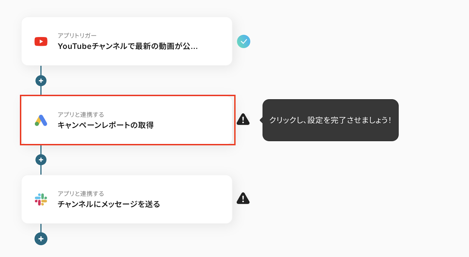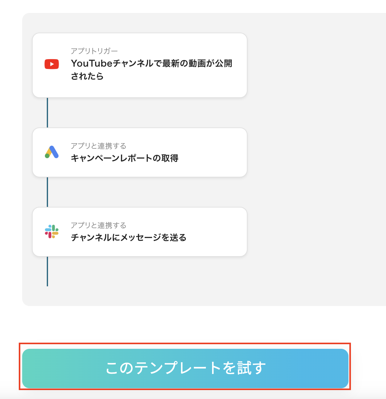このワークフローを活用すれば、YouTubeへの動画アップロードをきっかけに、Google Adsのキャンペーンレポートを自動で取得し、関係者に通知できます。