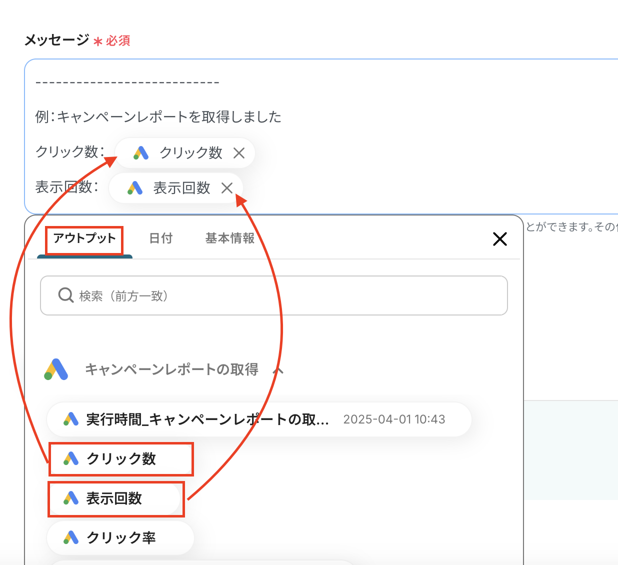 メッセージはGoogle Adsのアウトプットから選択し、メッセージを作成しましょう。