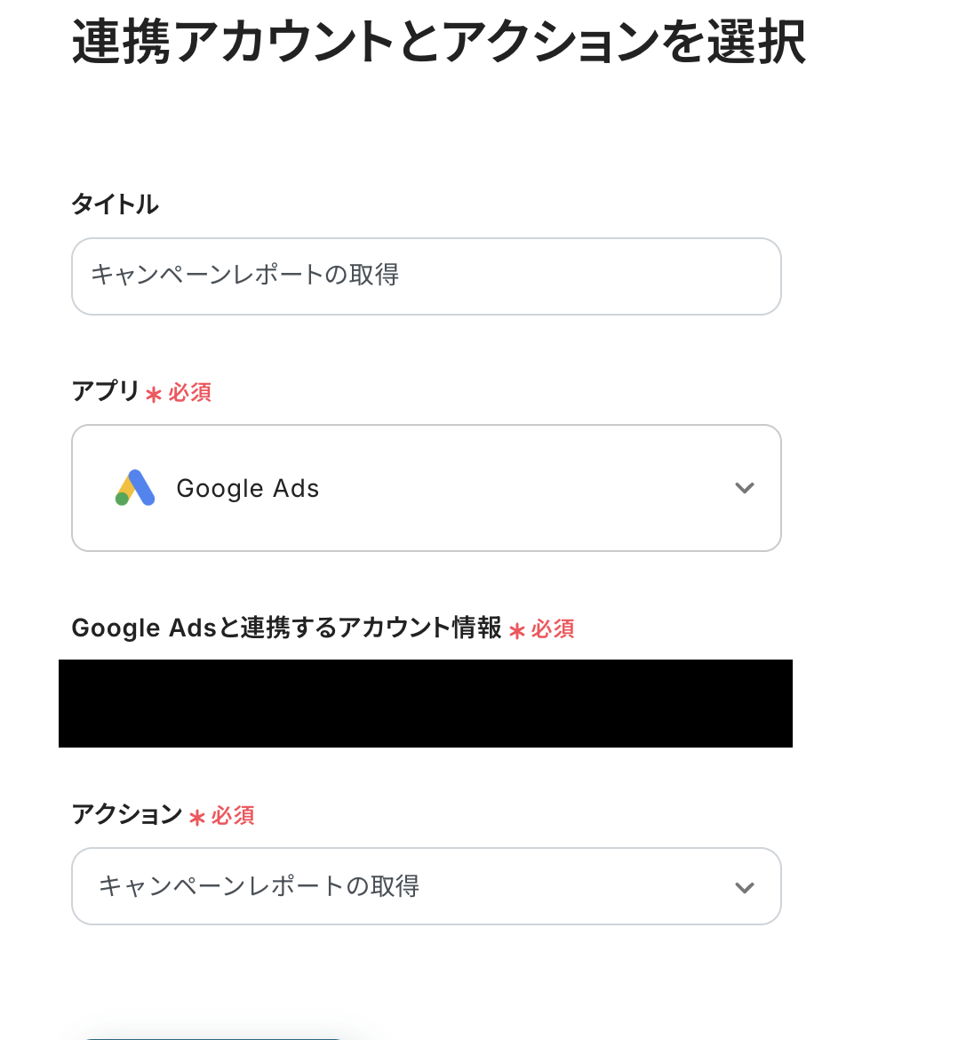 アクションは「キャンペーンレポートの取得」が選択されていることを確認し、次へをクリックしましょう。
