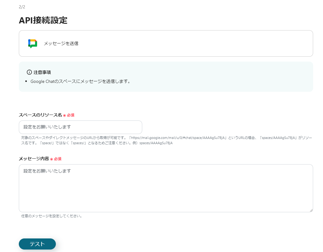 それぞれ入力ができたら「テスト」をクリックしてエラーの有無を確認しましょう。