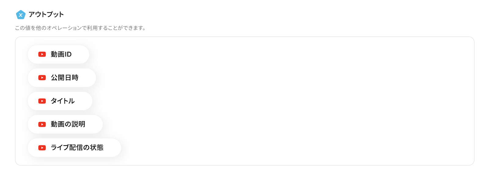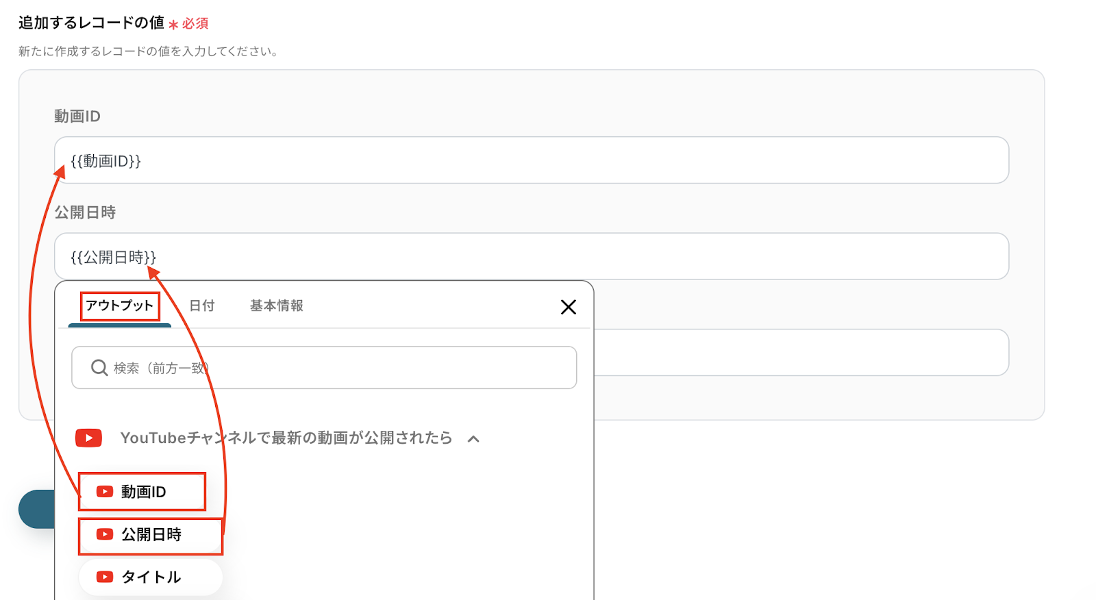 各項目に、YouTubeのトリガーで取得したアウトプットを選択しましょう。