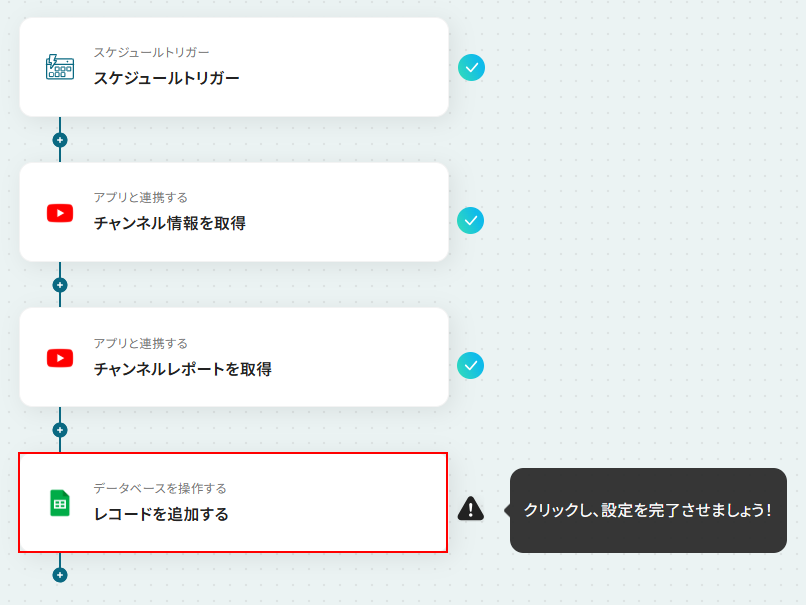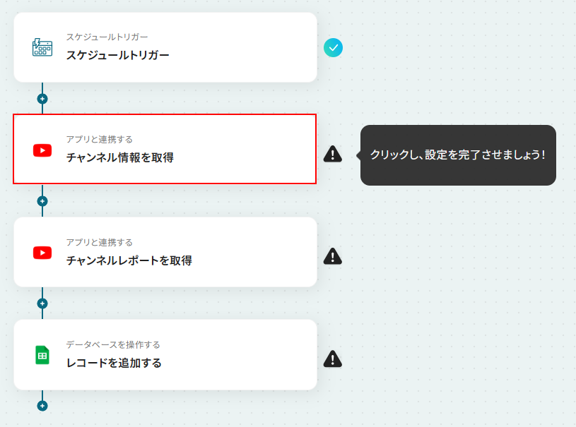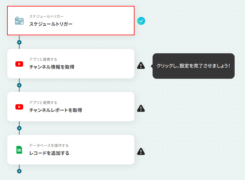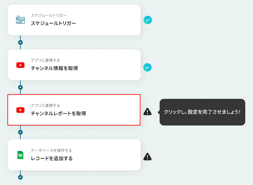 それではここから代表的な例として、定期的にYouTubeからチャンネルレポートを取得し、Google スプレッドシートに自動で追加するフローを解説していきます!