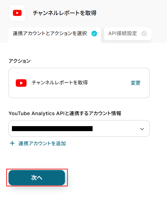 - 次に、オペレーションでYouTubeの「チャンネルレポートを取得する」アクションを設定します。