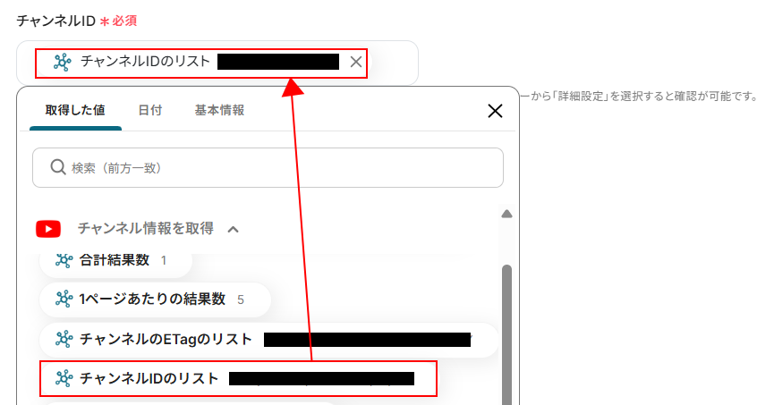 - YouTube Analytics APIからレポートを取得するアクションを設定する際に、対象となる任意のチャンネルIDを設定してください。