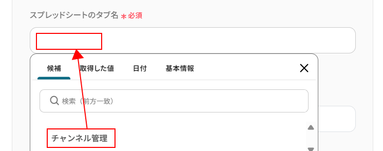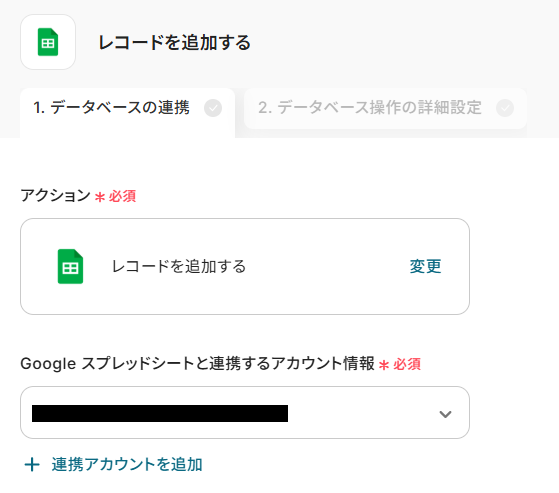 - Google スプレッドシートへレコードを追加するアクションでは、出力先となる任意のスプレッドシートIDと、書き込みたいシートのタブ名を指定してください。