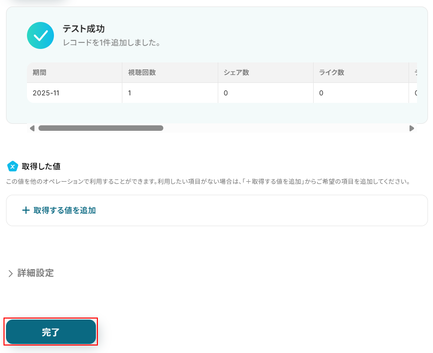 - 最後に、オペレーションでSPIRALの「レコードを登録」アクションを設定し、取得したYouTubeチャンネルレポートのデータをSPIRAL内の指定したデータベースに登録します。