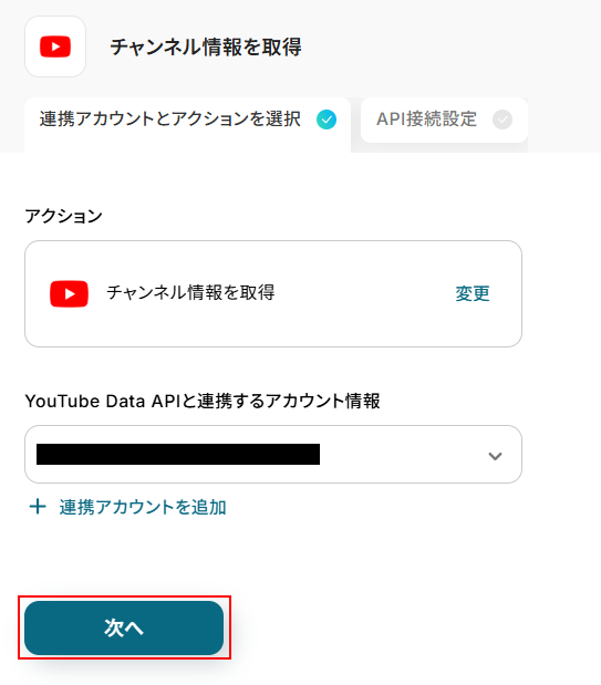 - 続けて、オペレーションでYouTube Data APIを選択し、「チャンネル情報を取得」アクションを設定します。