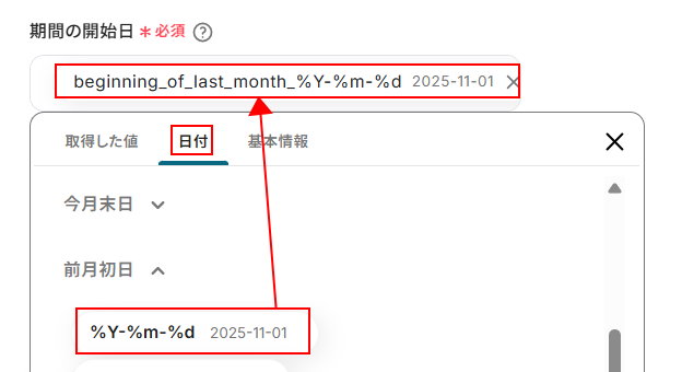期間の開始日にはデフォルトで先月の初日が設定されていますが、変更することも可能です。