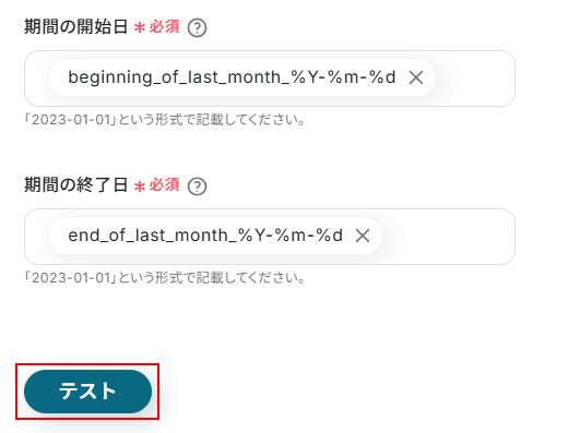 期間の終了日も同様にデフォルトで先月末日が設定されています。