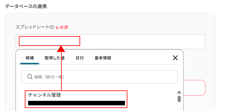 - Google スプレッドシートにレコードを追加するアクションを設定する際に、データを記録したい任意のスプレッドシートIDおよびタブ名を指定してください。