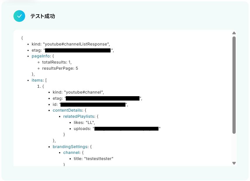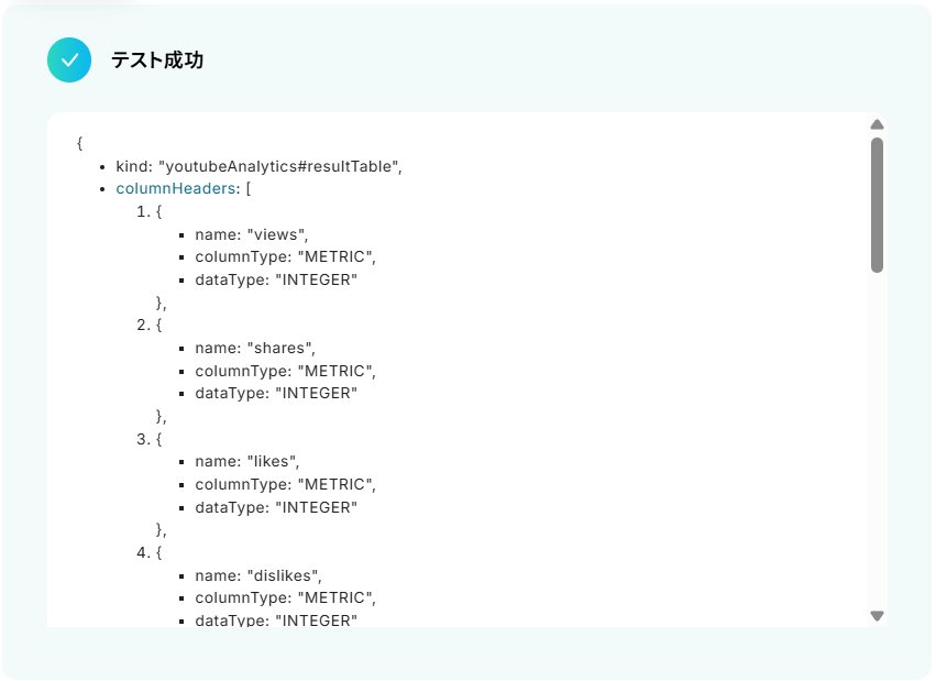 テストに成功するとテスト成功画面と取得した値が表示されますのでご確認ください。