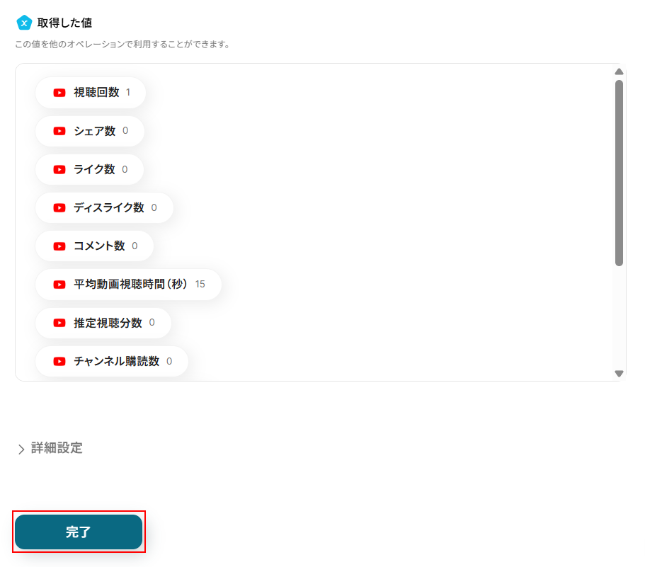 - YouTube Analytics APIでレポートを取得するアクションでは、任意の期間の開始日と終了日を設定可能です。目的に応じた期間を指定してください。