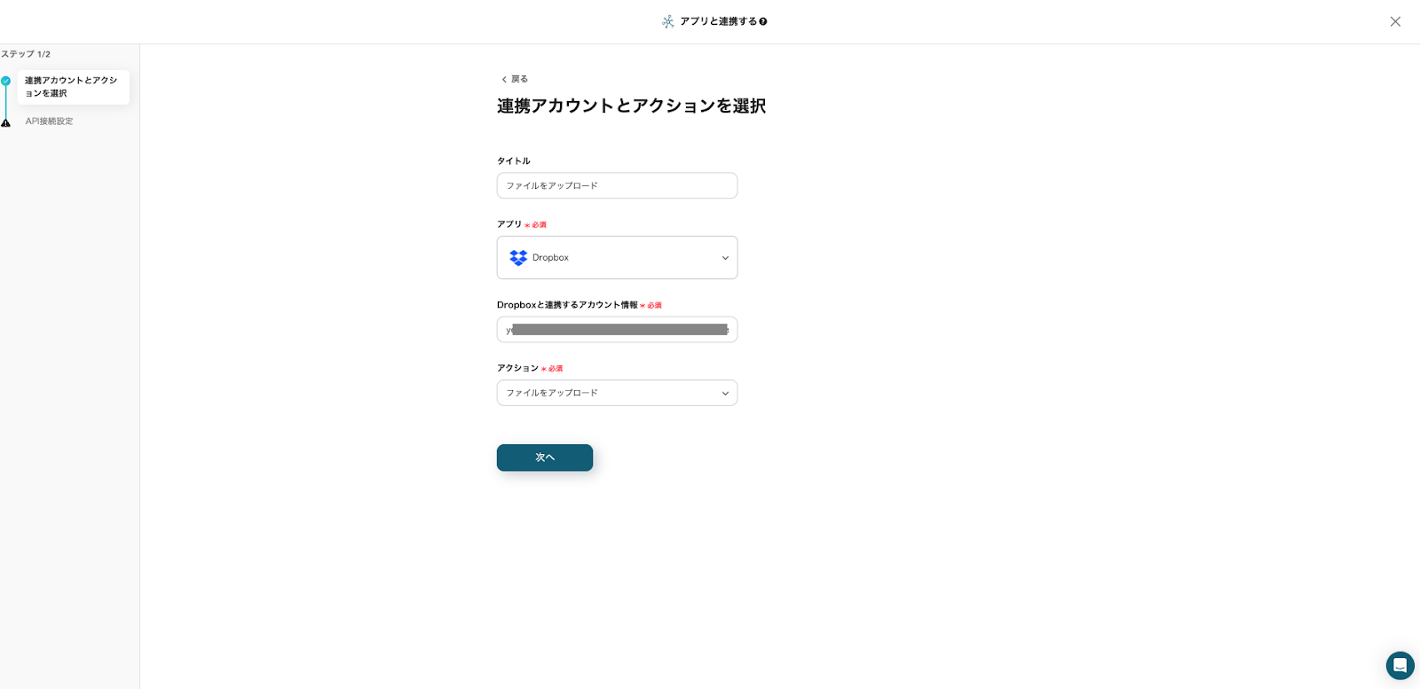 タイトルの任意編集とアカウント情報の確認を行い、「次へ」をクリックしてください。