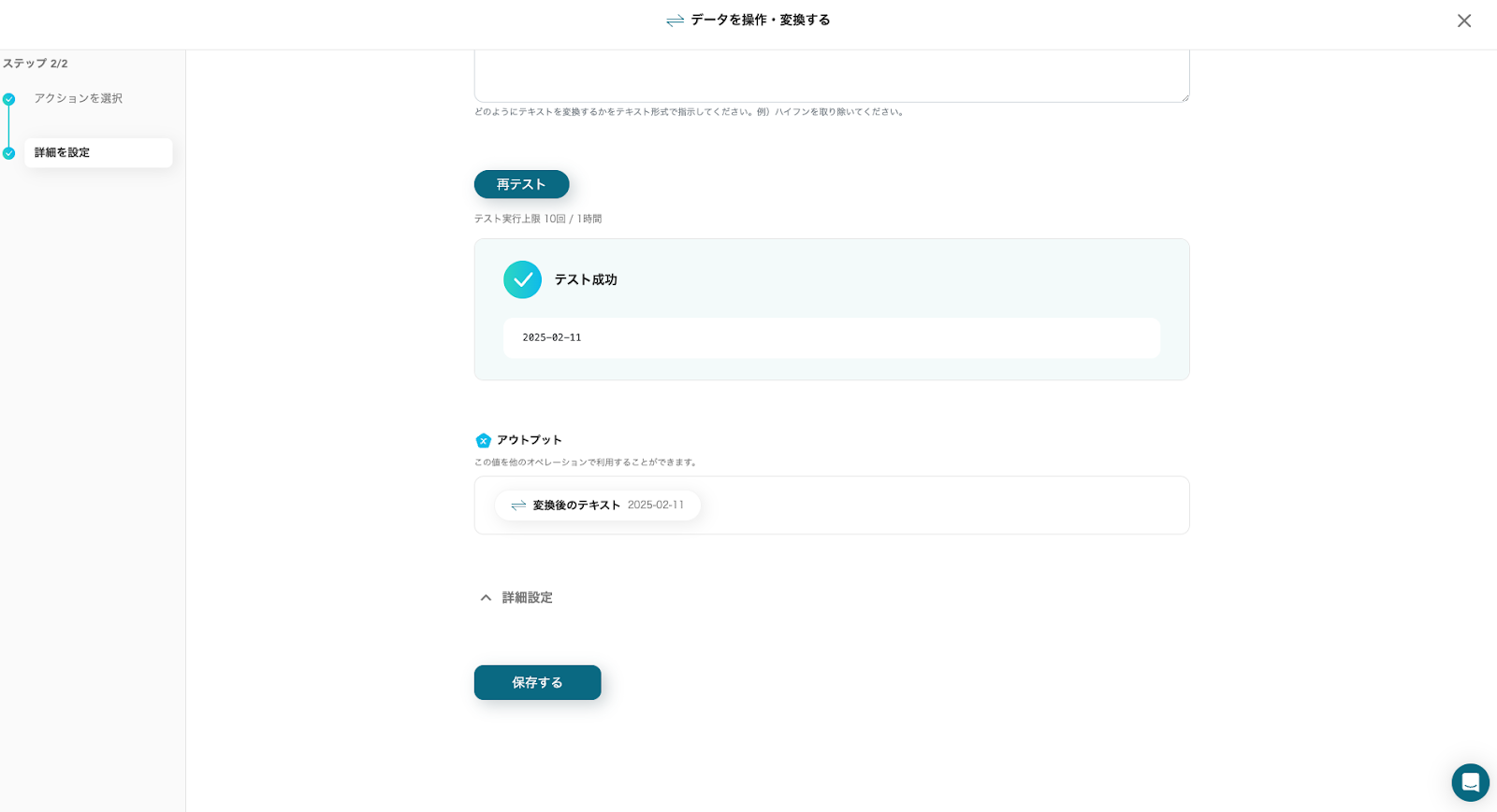 アウトプットに先週の日付が出力されていることを確認し「保存する」をクリックしてください。