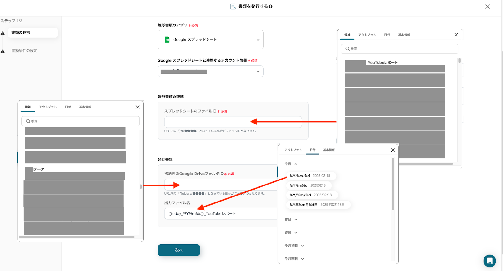 「スプレッドシートのファイルID」と「格納先のGoogle DriveフォルダID」は、注釈を参照しURLから該当箇所を引用するか、候補からIDを選択してください。