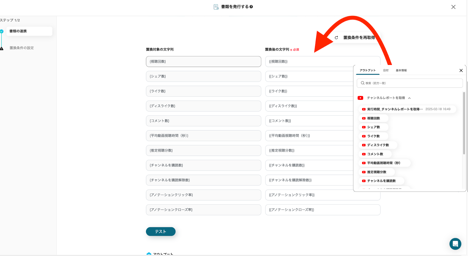 「置換後の文字列」の入力欄をクリックしYouTubeから取得したレポートデータを選択してください。
