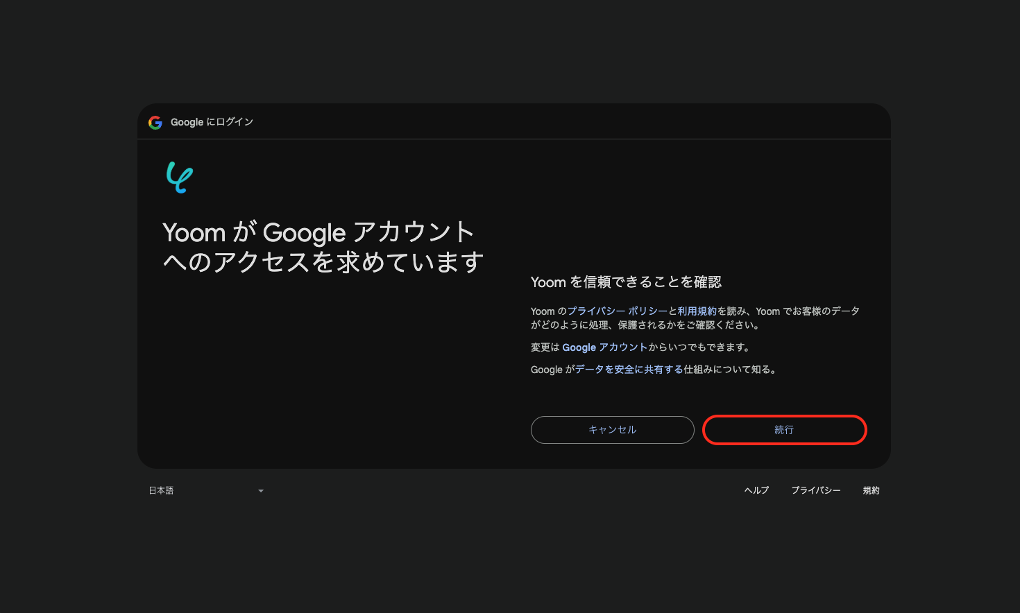 「Yoom が Google アカウントへのアクセスを求めています」と表示されているページで「続行」を押すと、Google スプレッドシートのマイアプリ登録が完了します。