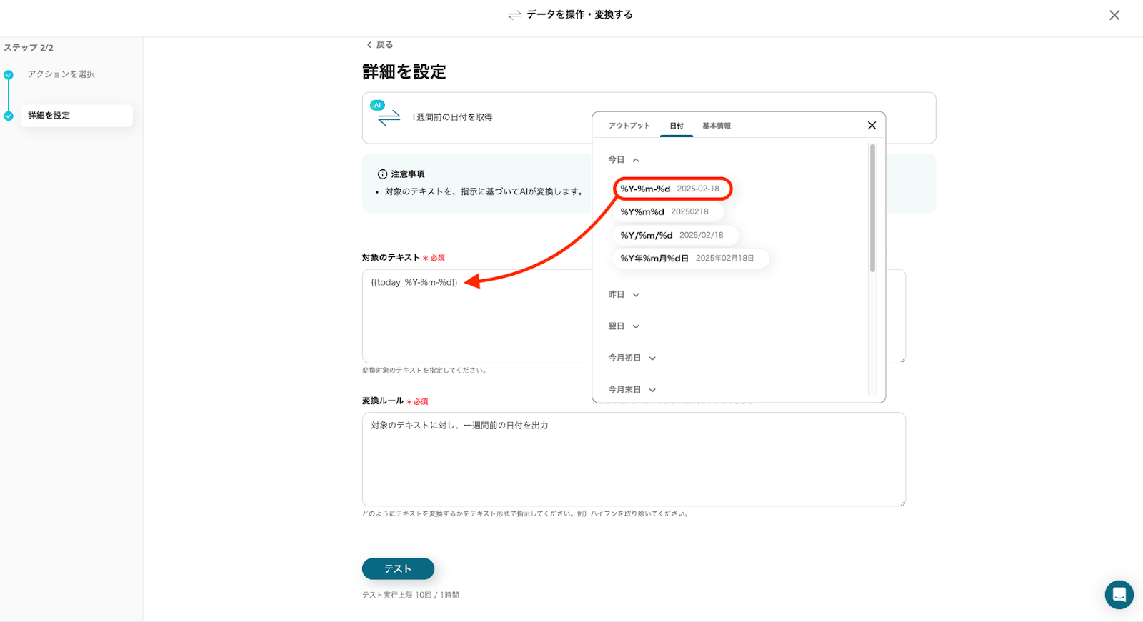 「対象のテキスト」は、入力欄をクリックし”日付→今日”から「%Y-%m-%d」を選択してください。