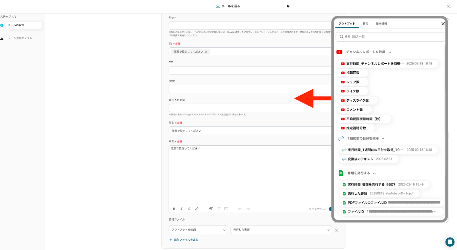 「出力ファイル名」は任意で編集できます。今回はファイル名に日付を入れるため、”日付→今日”の値を含むファイル名を設定しました。