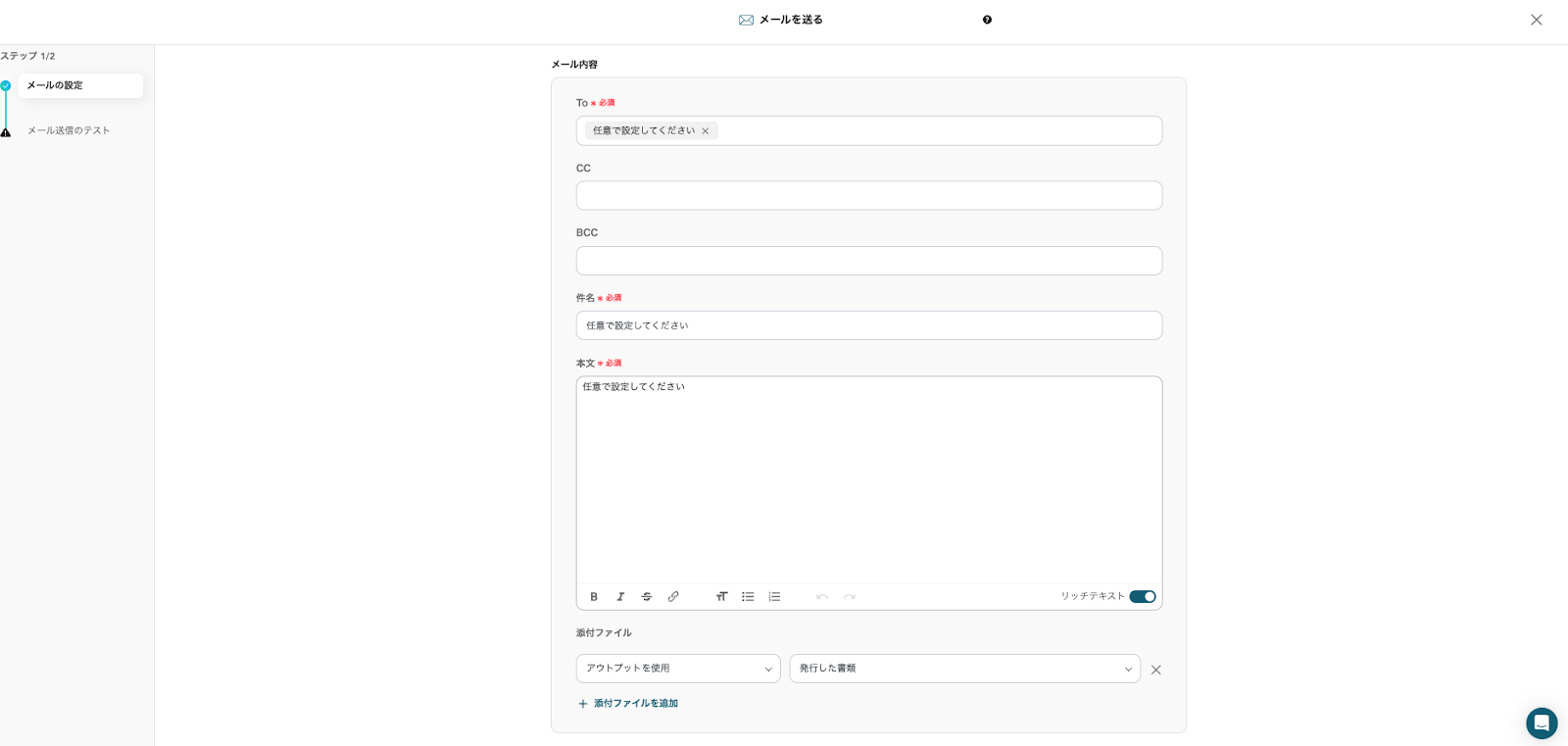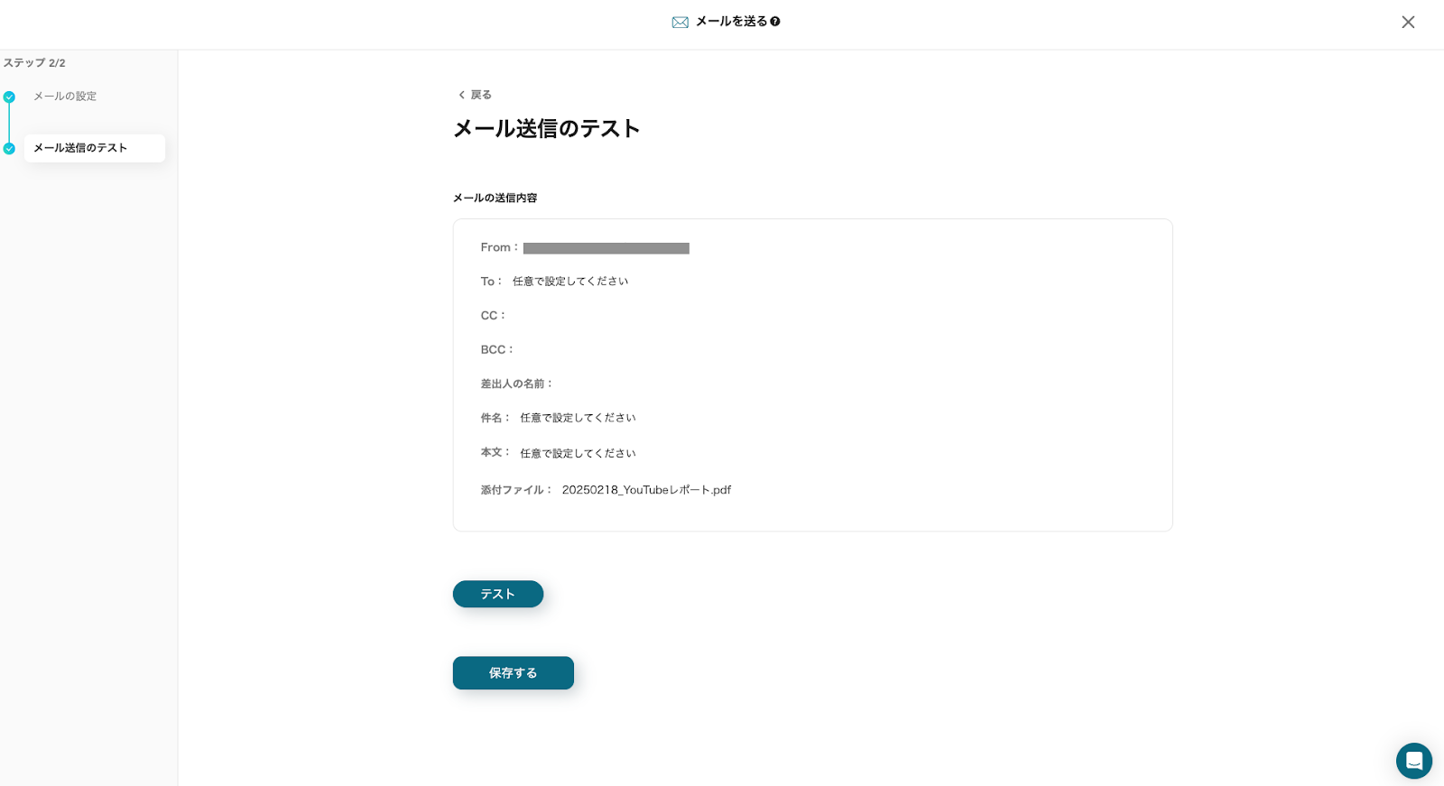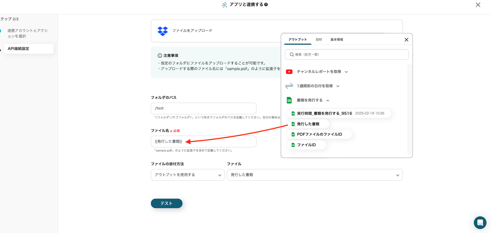 「ファイルの添付方法」は、テンプレートを活用しているためすでに設定は完了しています。画像と同じ状態であることを確認したら「テスト」をクリックしてください。