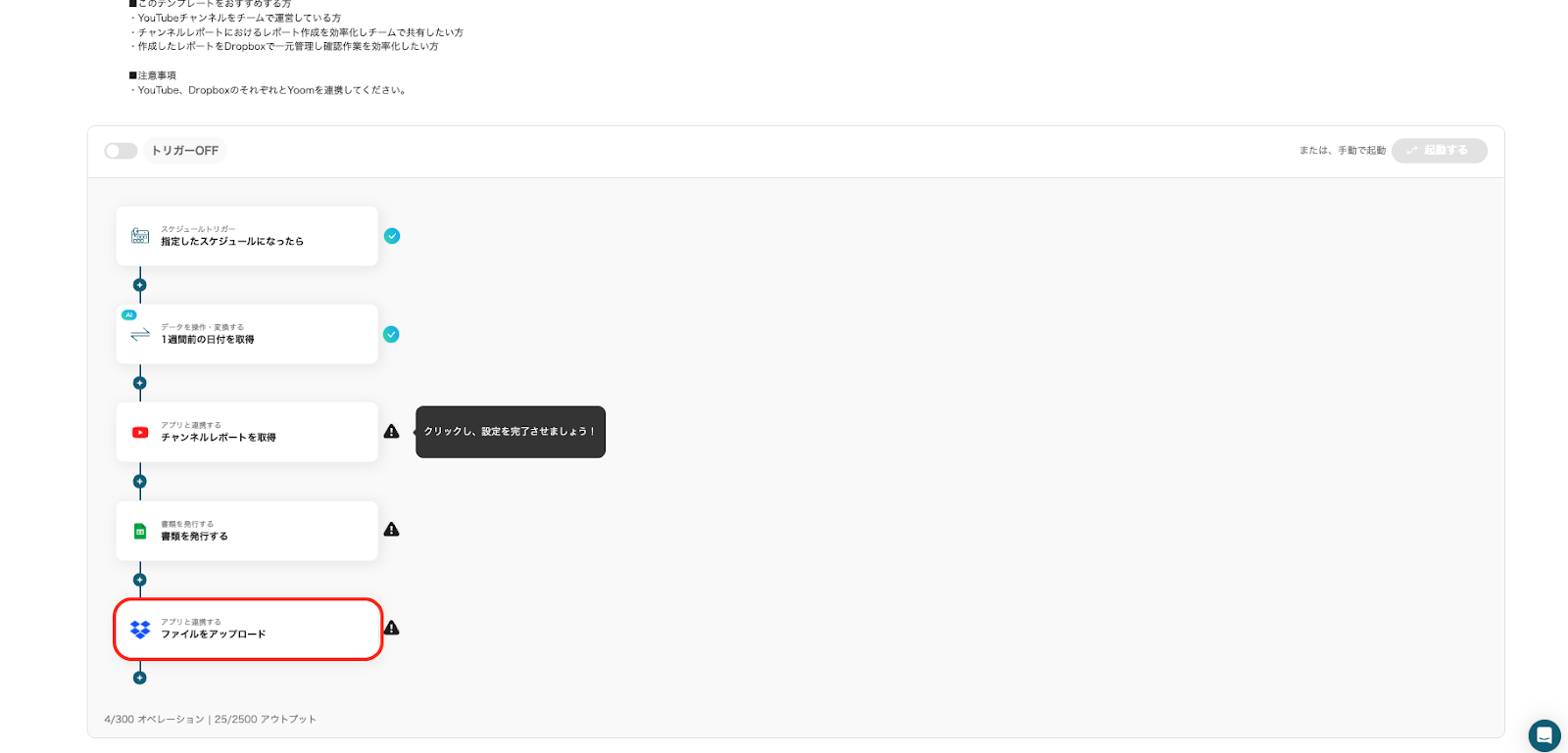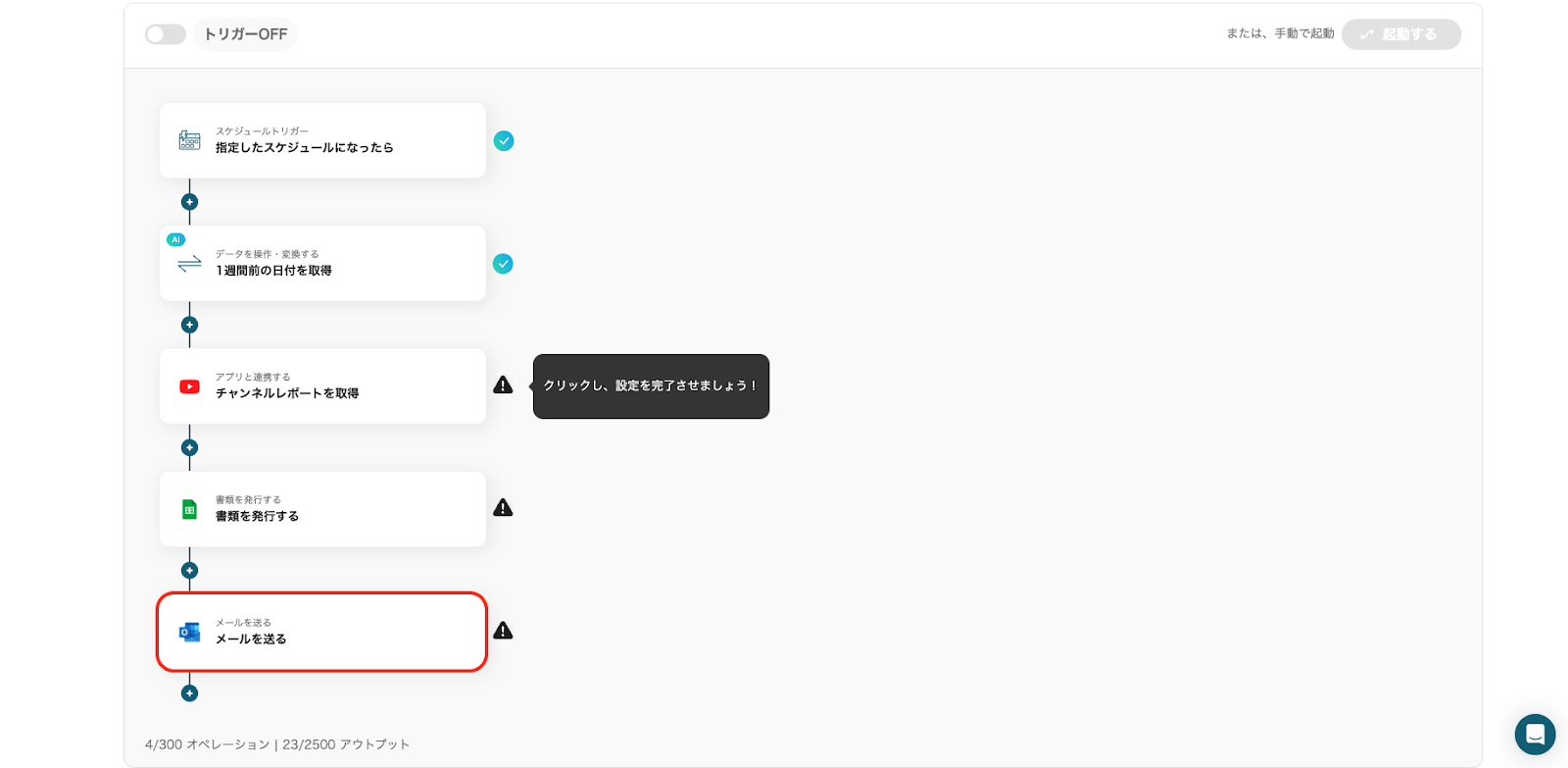 最後に「トリガーをON」をクリックし、フロー稼働の準備が完了です。これで、毎週YouTubeのレポートを取得し書類を自動作成してGmailで送信することができます。