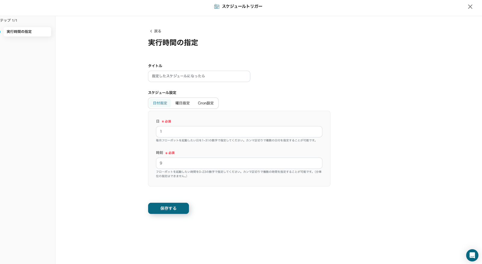 「スケジュール設定」は、「日付指定」「曜日指定」「Cronの設定」を選択できます。