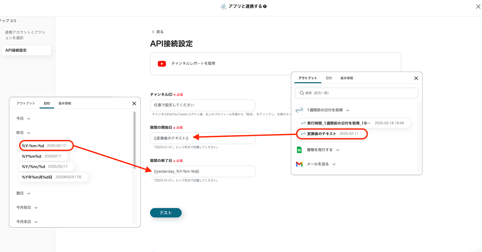 「期間の開始日」は、入力欄をクリックしステップ3で取得した「変換後のテキスト」を選択してください。