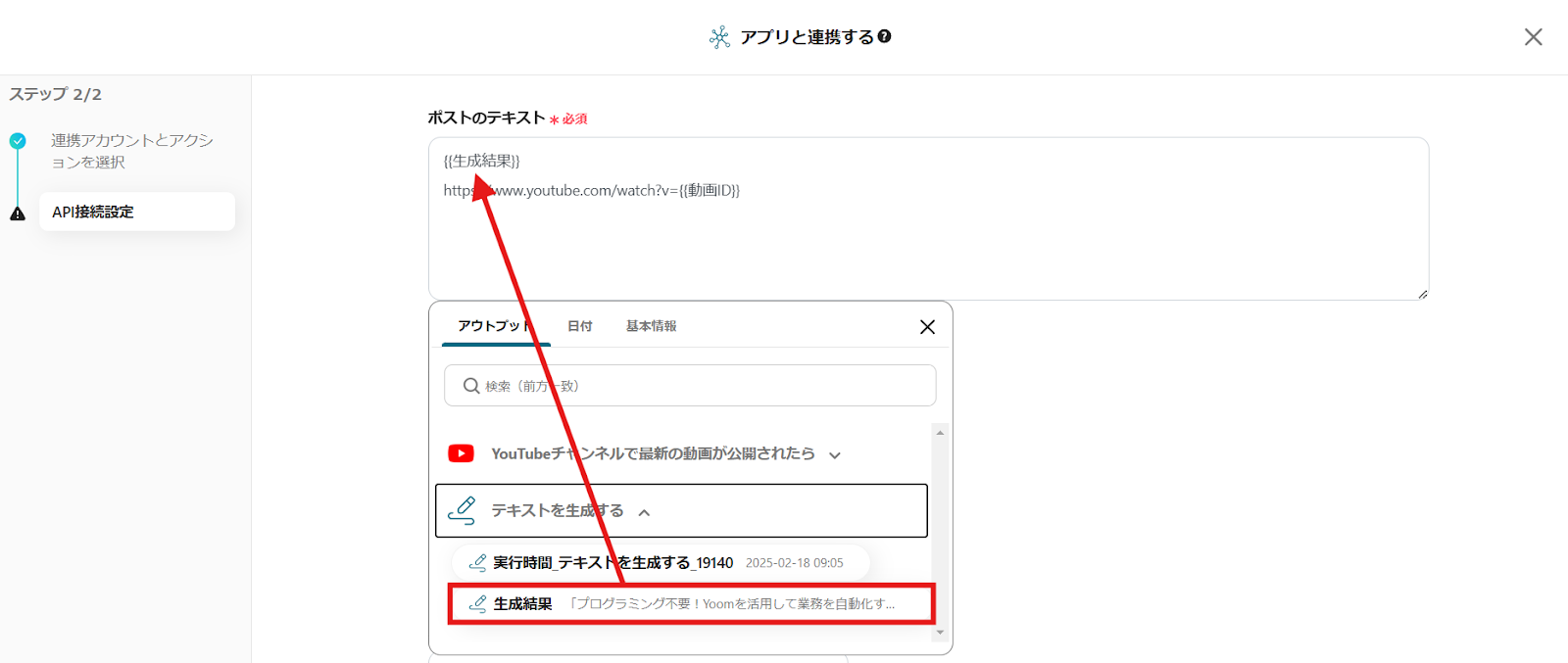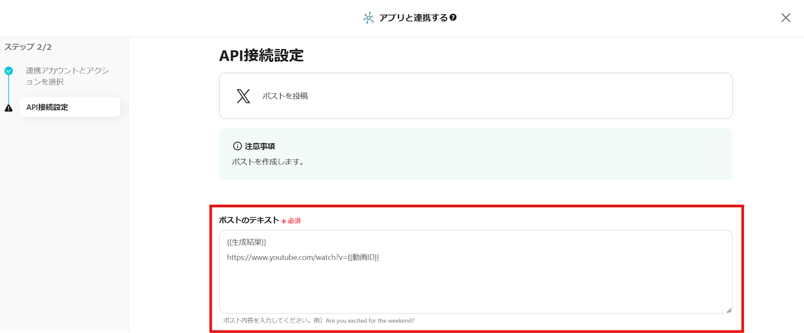 画像のように、YouTubeで公開された動画タイトルや概要欄の説明を自動流用して投稿分を作成するため、動画の内容に沿った内容で毎回違う文章を投稿可能です。