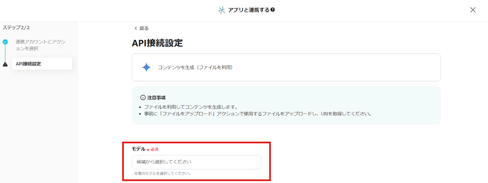 画像の場合は1.5 flashを使用しているため、同じものをモデルとして設定しましょう。