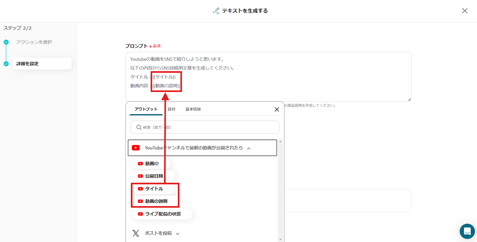 まず、YouTubeで新しい動画が投稿されるとフローが起動します。そして、あらかじめ定めたプロンプトに沿い、その動画タイトルや概要欄の情報を基にSNS投稿用の文章を自動作成可能です。
