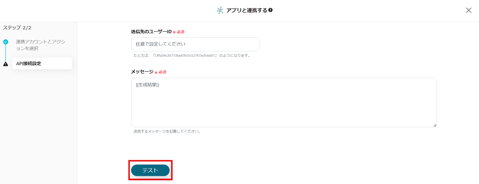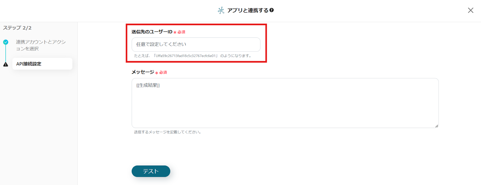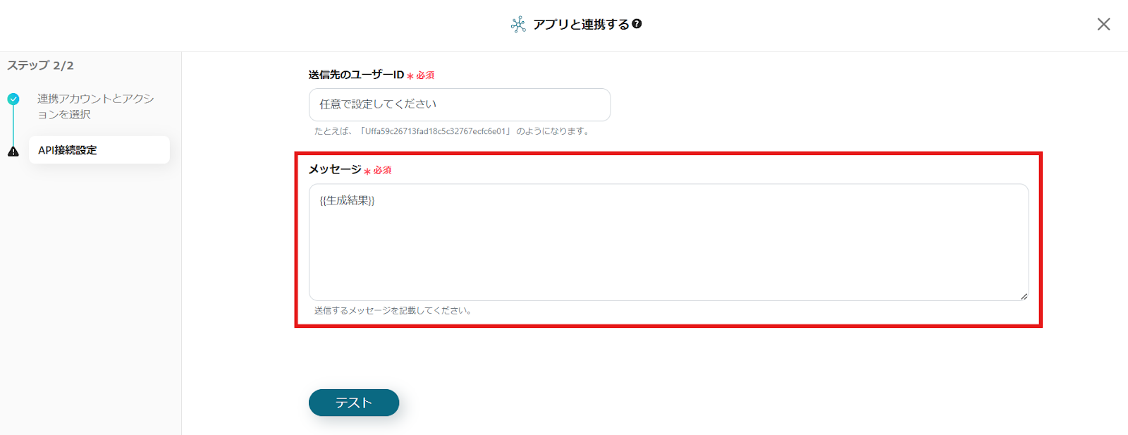 メッセージの設定ができたら、下部にあるテストボタンを押してください。