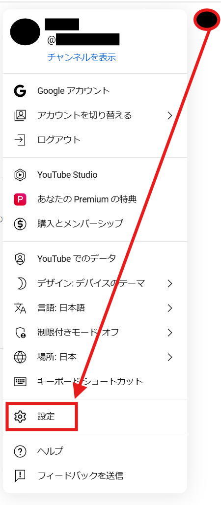 YouTubeにアクセスし、右上のアイコンをクリックして設定を選択します。