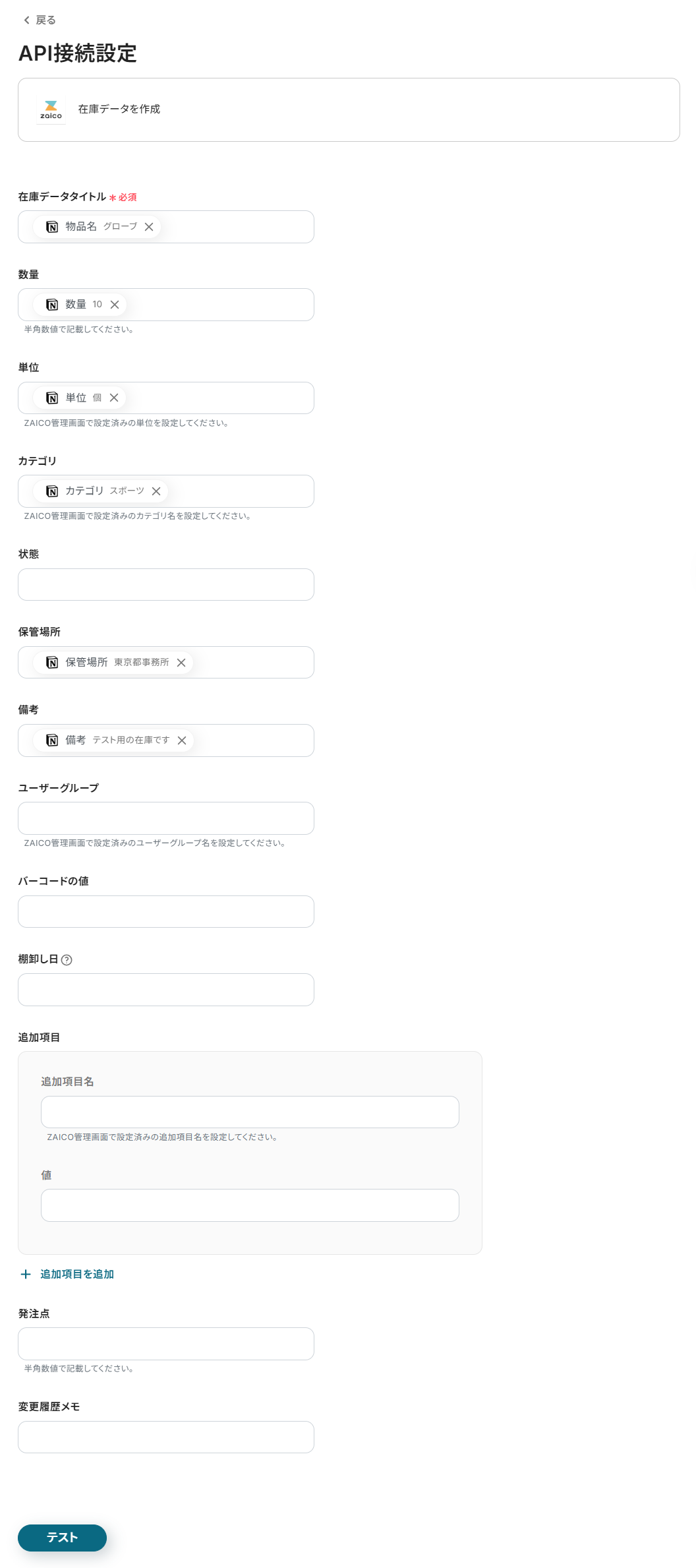 続いて、zaicoにNotionから取得した値を利用して在庫データを作成する設定を行います。