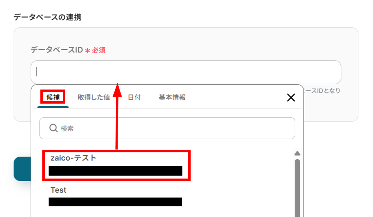 データソースID(以下の画像のように、入力バークリック後の『候補』から情報を選択することも可能です。)を入力したら、Notionにテスト用のページを作成してください。