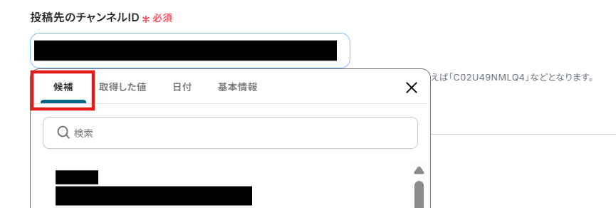 投稿先のチャンネルID:入力欄をクリックすると候補が表示されるので、その中から選択しましょう。