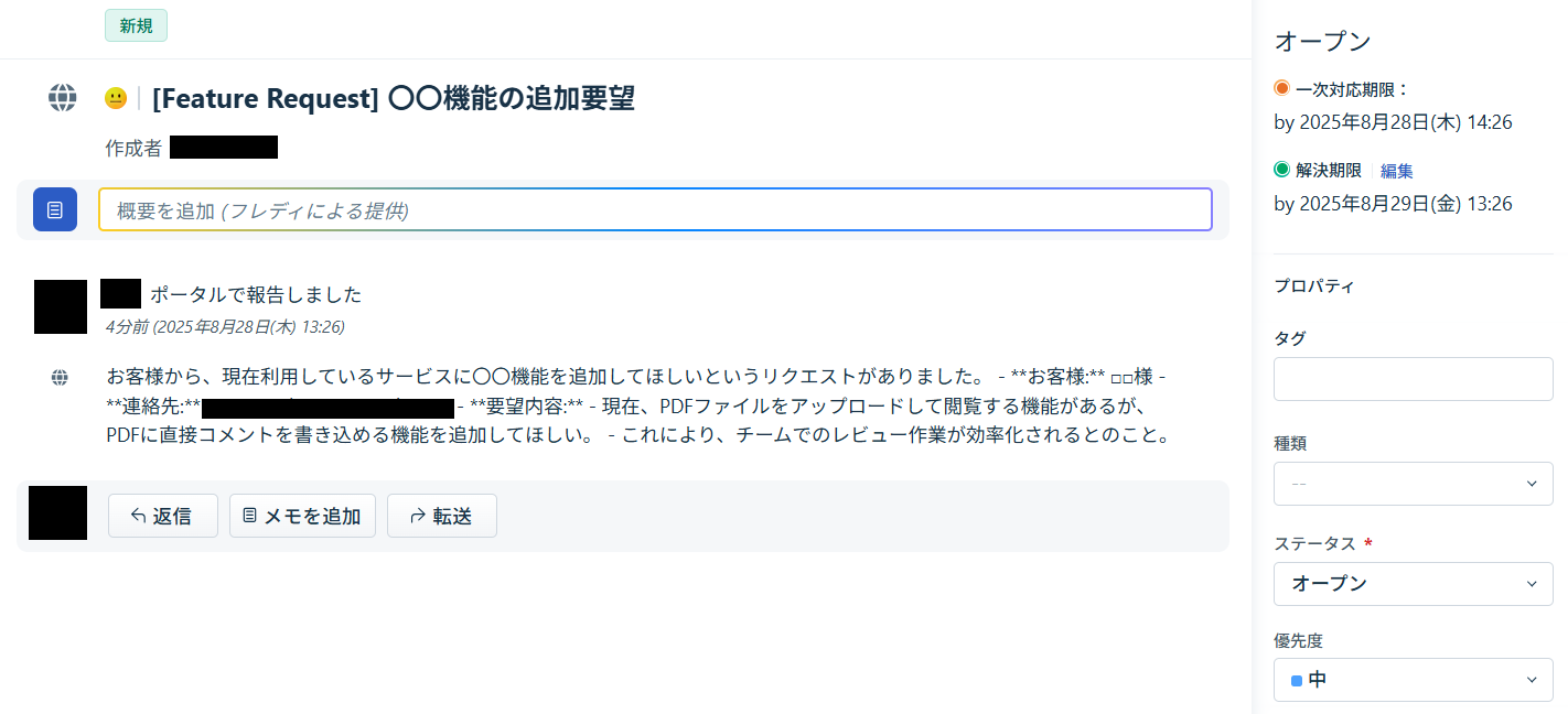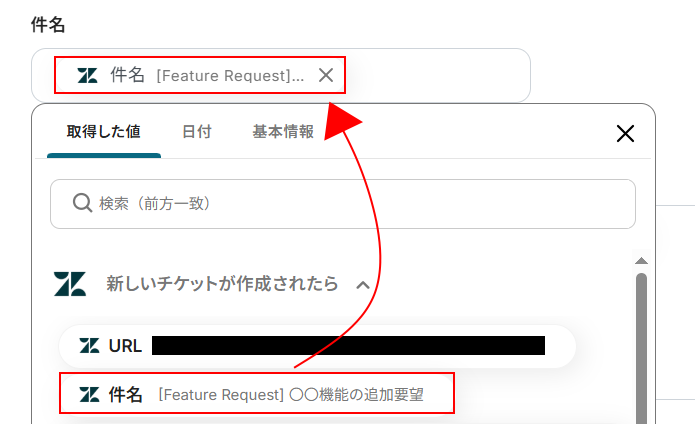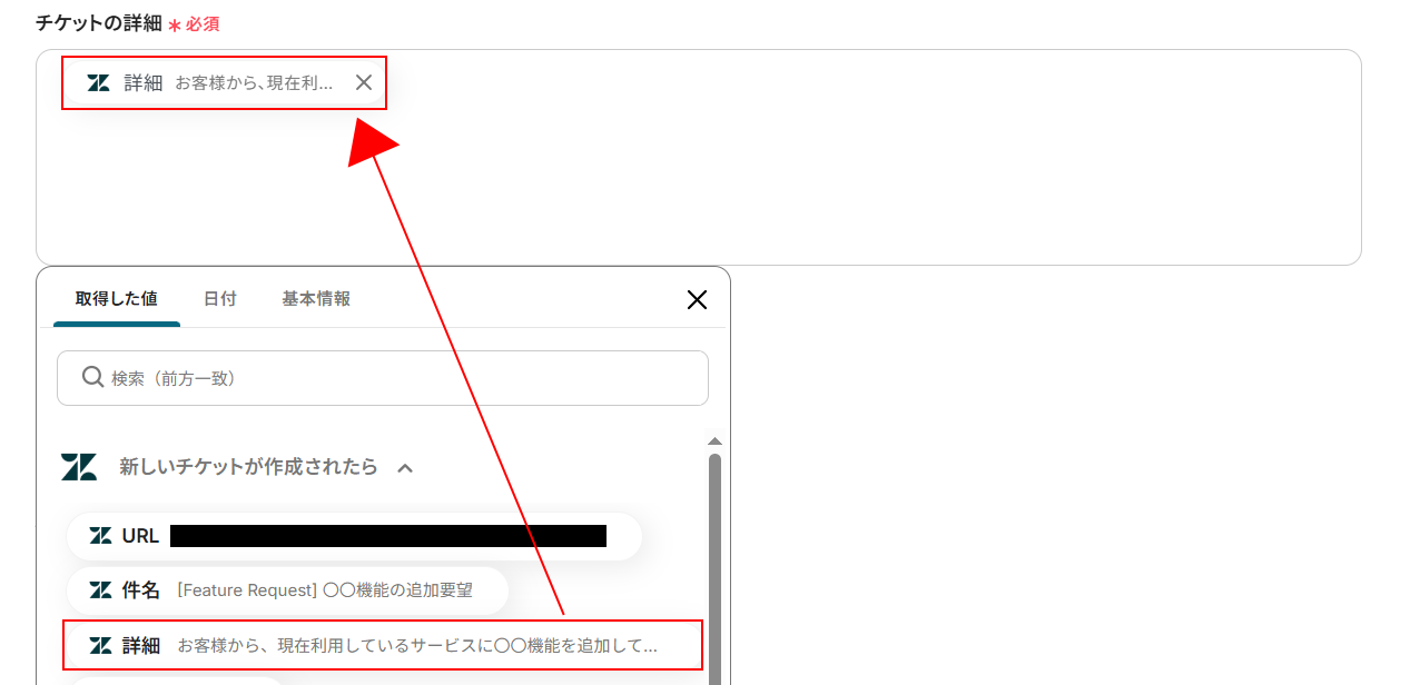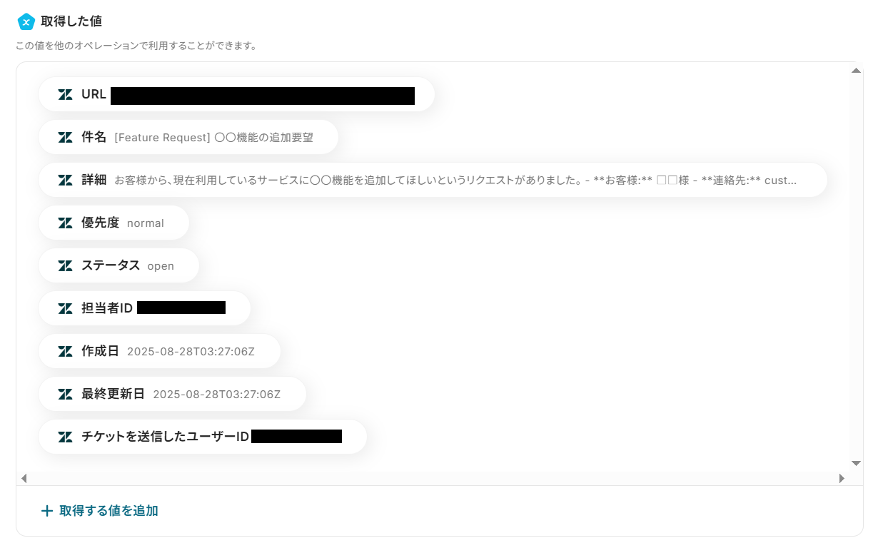 チケットの詳細も件名と同様に取得した値から設定可能です。