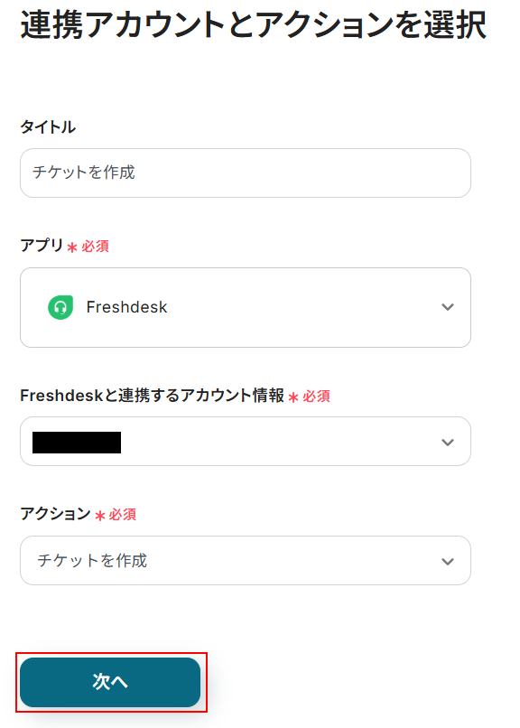 Freshdeskと連携するアカウント情報には、ステップ1で連携したアカウントが設定されています。