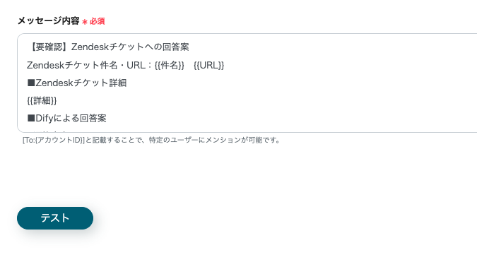→テストをクリックします。 →成功 Difyの回答案(返答内容)などが取得できます。