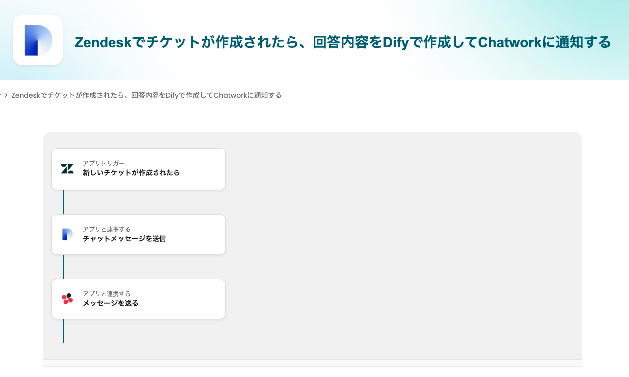 ここからは、【Zendeskでチケットが作成されたら、Difyで問い合わせの回答生成してChatworkに投稿する】プログラミングなしで構築するフローの手順を解説します。
