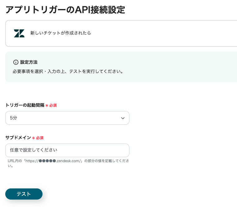 こちらでは、Zendeskで発行されたチケット情報を取得する設定を行います。
