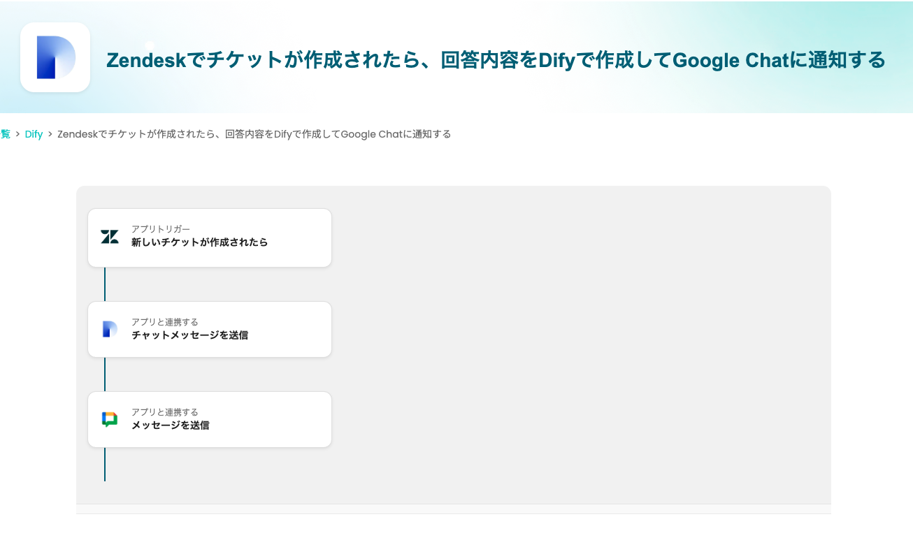 ここからは、【Zendeskでチケットが作成されたら、Difyで問い合わせの回答生成してGoogle Chatに投稿する】プログラミングなしで構築するフローの手順を解説します。