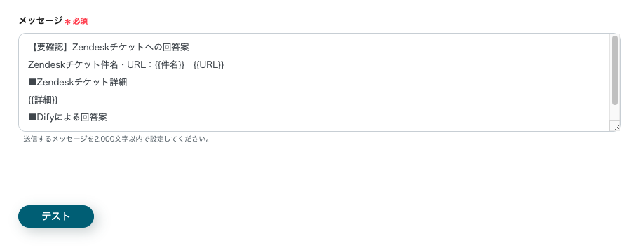→テストをクリックします。 →成功 Difyの回答案(返答内容)などが取得できます。