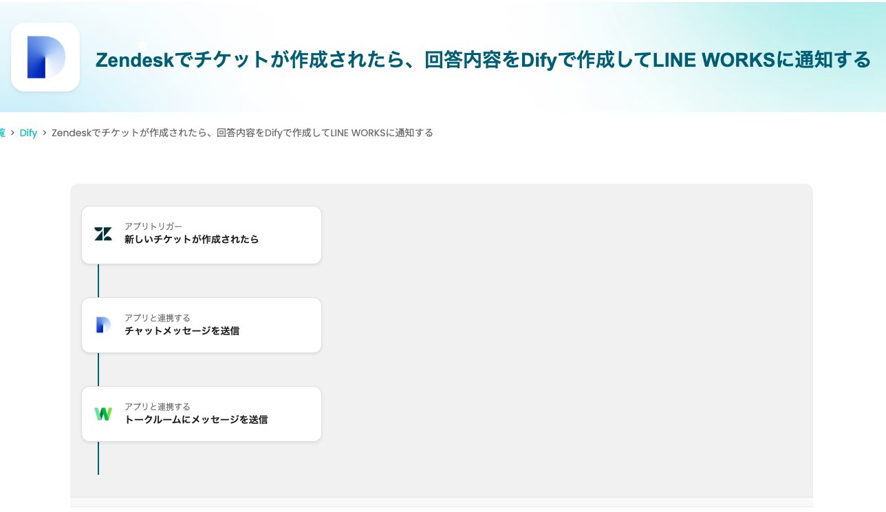 ここからは、【Zendeskでチケットが作成されたら、Difyで問い合わせの回答生成してLINE WORKSに投稿する】プログラミングなしで構築するフローの手順を解説します。