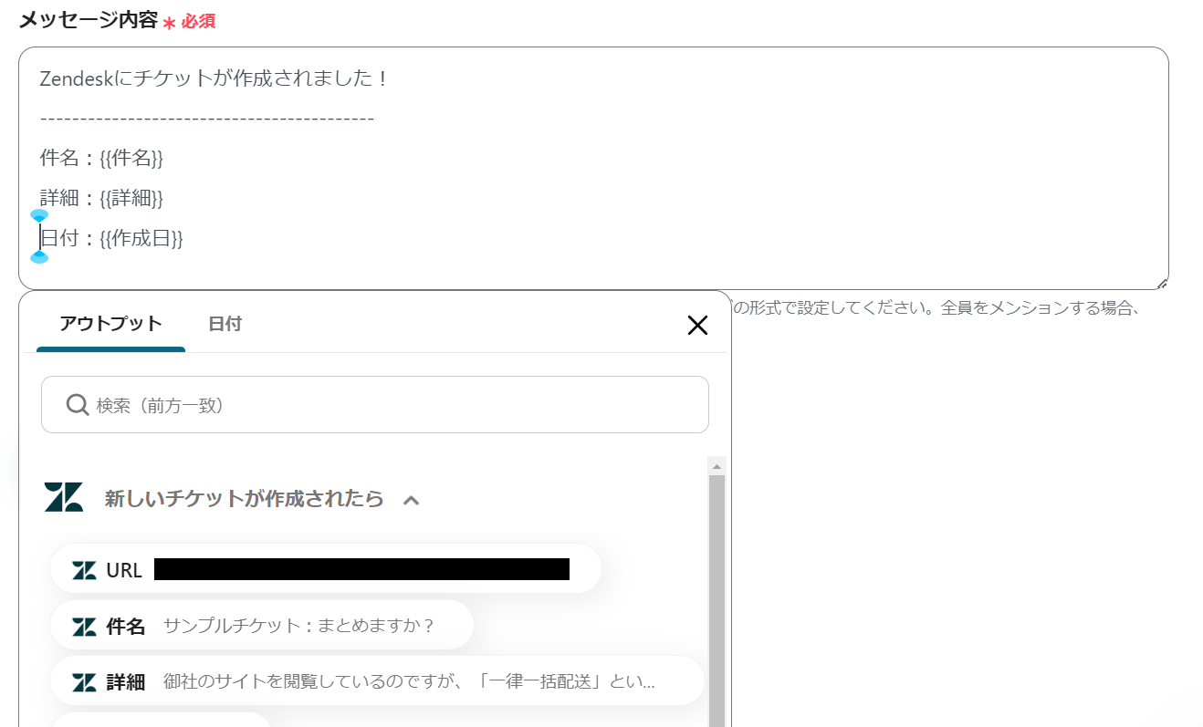 メッセージボックス内をクリックすると、先ほどのZendeskの設定でテストで送信した内容が一覧で表示されるようになっています。
