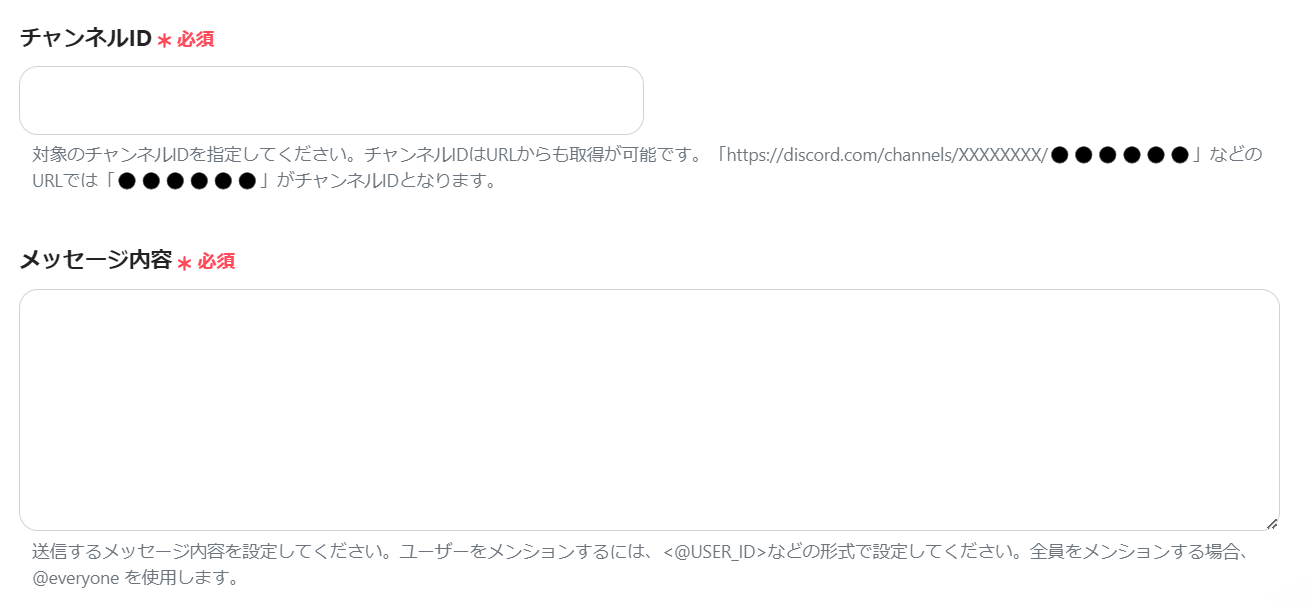 まずはチャンネルIDを入力します。チャンネルIDはDiscordチャンネルのURLに表示されているのでコピペでOKです!