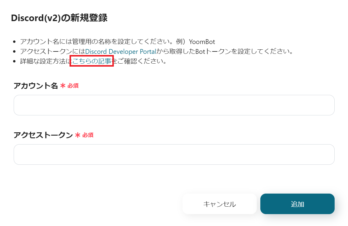 あとは赤枠のDiscord(v2)のマイアプリ連携詳細ページを確認しながら登録を進めましょう。