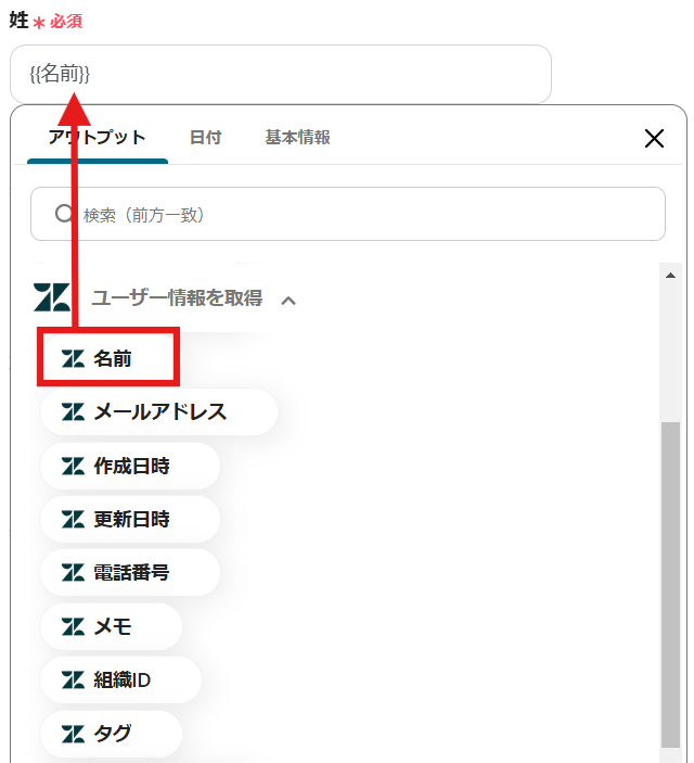 「ユーザー情報を取得」のアウトプットから「名前」を選択しましょう。